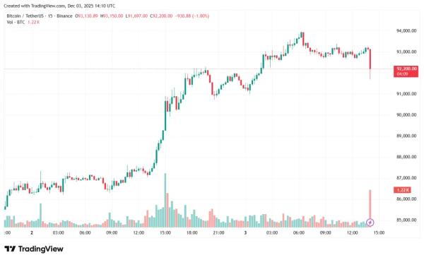 3 декабря цена первой криптовалюты поднялась до ~$93 800, восстановив потери после падения. Аналитики Glassnode и Fanara Digital объяснили положительную динамику рекордным притоком средств и снижением волатильности. На момент написания